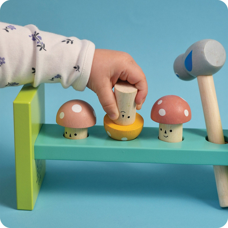 以森林為主題的蘑菇敲敲樂,內含4個微笑蘑菇和一支藍色小鳥形狀的木槌,咚咚咚~蘑菇蘑菇,通通打進洞裡面,訓練孩子的手眼協調能力。