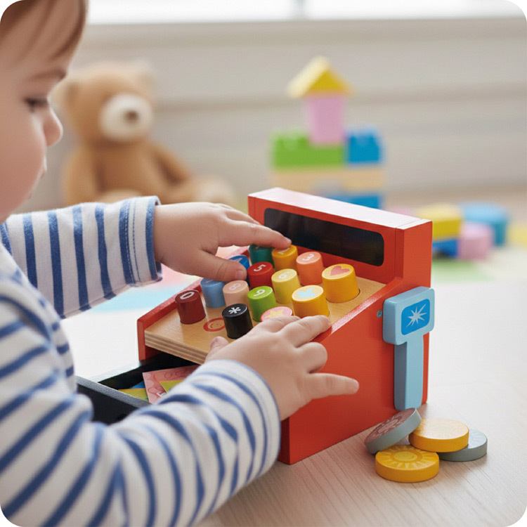 紅色的收銀機,搭配繽紛的數字按鈕和可吸附在收銀機的條碼掃描器。孩子在角色扮演的時候,使用收銀機裡面的硬幣和紙鈔跟客人結帳,模擬交易的行為,並增加對數字和金錢的認知。